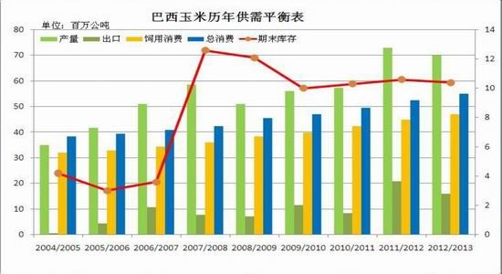 巴西2011/12作物年度玉米产量为7273万吨,巴西玉米产量多数在国内消化,因家禽需求量巨大,且猪肉工业迅猛增长。目前巴西玉米库存现有1050万吨,是历史上库存量最多的一年。预计2013年巴西国内玉米消费5050万吨,出口1500万吨,玉米库存量提高到1750万吨。2012年巴西玉米出口已经超过年度最高值,其将取代阿根廷成为全球第二大玉米出口国。从数据看,巴西玉米的产量在近两年增幅较大,超过了其国内总消费和饲用消费的增幅,这也是巴西玉米库存较往年提高的原因。巴西玉米的库存增加和政府不限制谷物出口意味着未来巴西未来肩负着全球玉米产量增加的更多重任,未来巴西天气对全球玉米产量的影响至关重要。