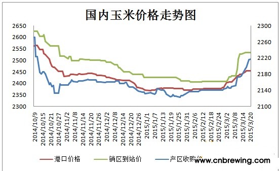 节后国内玉米价格涨势强劲,截止3月20日,国内玉米均价约为2400元/吨(北方产区、南方销区及港口玉米等地的价格平均值),较上周同期增长20元/吨,交节前涨幅更是巨大,约为100元/吨。图中明显可以看出,产区玉米价格涨势强劲,主要取决于东北玉米临储收购政策的支撑。