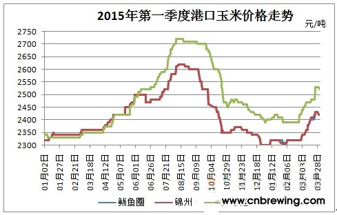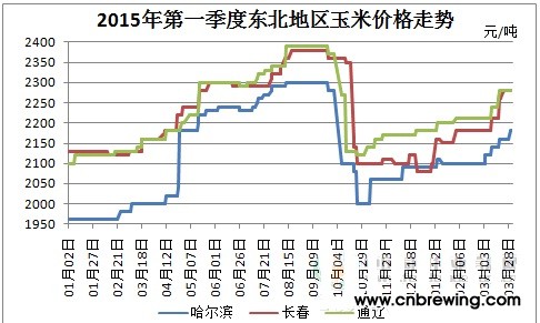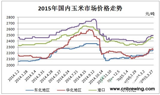 中国饲料行业信息网玉米频道:2015年第一季度国内玉米价格整体震荡上行,截至3月底,东北产区玉米收购均价为2250元/吨,较1月初上涨130元/吨;华北产区均价2270元/吨,较1月初涨幅逾120元/吨;南方销区到站价约2490元/吨,较1月初上涨约85元/吨。