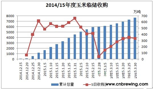 据中国饲料行业信息网跟踪数据显示,截至3月30日,临储玉米收购量达7612万吨,较全年收储总量高出693万吨,临储收购“破7”,再创新高。在去年的巨量收储背景下,市场对2014/15年度的临储收购虽有着一定预期,但持续加大的收储力度或多或少让市场有些“意外”,在距离临储收购结束尚余一个月的情况下,临储再次创下新纪录。