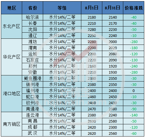 一、8月国内玉米价格持续走低 华北产区跌幅较大