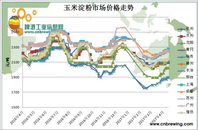 3月份以来,受环保等因素影响,华北个别厂家出现小幅减产情况,对全行业开工率影响不大。目前淀粉行业开工率在73%左右,略低于上月同期的75%左右水平。