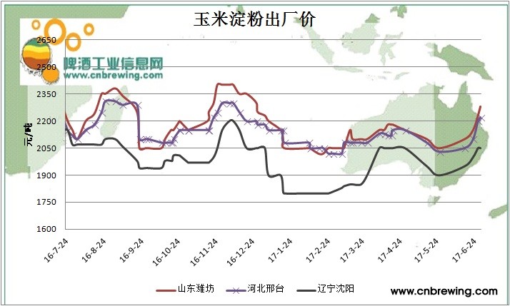 6月中旬国内新麦上市,贸易主体多将目光转向新麦收购,玉米贸易有所下降,华北等地深加工企业玉米库存持续下滑,为保障生产,下游深加工企业持续小幅上调玉米收购价格以刺激到货,国内玉米市场价格全面回升,加之入夏以后,淀粉下游需求有所回升,成本及需求双重支撑下,国内淀粉价格整体全面回升。