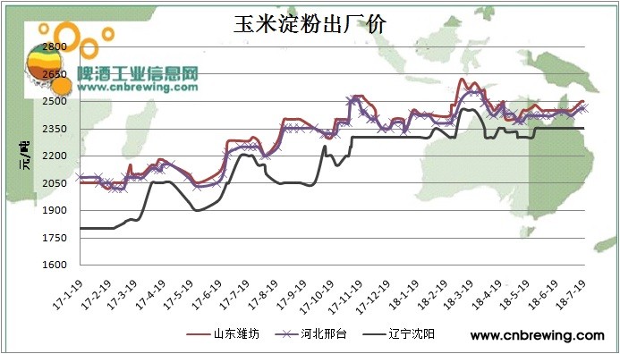 本周国内淀粉现货价格整体平稳,局部小涨,东北主流价格在2280-2350/吨,山东主流报价2500/吨左右小涨20/吨,河北主流价2460/吨,辽宁主流价2350/吨,黑龙江2280/吨小涨30/吨。淀粉现货市场价格整体高位维稳,短期内现货价格整理。深加工企业陆续轮番进入季节性检修期,行业开工率持续下滑,提振玉米淀粉价格,阶段性库存偏低,旺季消费等也对淀粉价格形成强有支撑。中美贸易战升温,造成玉米深加工下游产品价格上涨,淀粉加工企业利润也出现好转,目前国内淀粉行业开机率保持在75%左右的较高水平。虽然国内淀粉库存下降,但依旧偏高的库存量依旧抑制着淀粉的涨幅。随着淀粉需求旺季来临,淀粉提货速度加快,需求向好,供需收紧,预计短期内淀粉偏强走势为主,但涨幅有限。