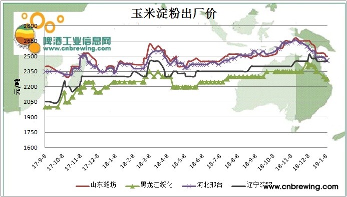 原料玉米价格走势趋弱,淀粉开机率整体处于高位,叠加行业库存持续累积,淀粉现货报价弱势运行。考虑到中美贸易谈判缓和进口预期增加及下游淀粉等需求疲软影响,短期内淀粉价格难以提振。由于玉米内外价差犹存,关注度集中在玉米进口速度和进口量上,但目前尚未有明确关于取消玉米关税的消息。目前全国米淀粉现货市场价格暂稳,局部市场价格微幅调整,市场观望气氛浓厚,多数市场人士稳定执行前期合同订单为主。截止1月11日,东北地区淀粉现货价格2300-2450元/吨。华北地区淀粉现货价格2450-2530元/吨。其中山东、河北地区主流市场报价2450-2550元/吨;河南地区主流报价2680元/吨,东北地区销报价2350-2500元/吨。