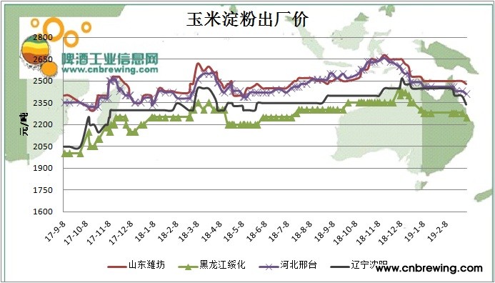 本周国内玉米淀粉整体平稳,局部小跌。对于玉米原粮而方,地储入市及2019年度临储拍卖推迟至6月份以后,起拍价格比去年提高50-100元/吨,市场投放量大幅减少,政策性利多,价格出现反弹,成本受到支撑。上周淀粉开机率69.18%,较前一周的60.35%回升8.83个百分点。淀粉库存86.53万吨,较前一周的83.09万吨增加3.44万吨,增幅为4.14%。价格方山东,河北地区玉米淀粉市场主流报价2430-2450元/吨,东北产区淀粉报价2220-2430元/吨。深加工企业陆续恢复开工,开工率逐步回升,而目前市场需求恢复缓慢,签单量不多,走货不快,淀粉库存持续积累,预计淀粉价格上涨空间有限。