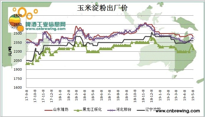 本周(5.5-5.10)淀粉价格整体维稳,华北零星企业小幅下调淀粉价格10-30元/吨不等。近期麦收腾库需求导致阶段性玉米卖盘偏强,玉米价格下跌且库存增加进一步压缩企业利润,淀粉价格偏弱运行。东北主注流报价2230-2430元/吨,华北报价2380-2480元/吨。截止5月3日当周82家样本淀粉企业玉米加工量为76.42万吨,环比-2.62万吨,开机率73.93%,环比-2.54。市场方面,山东,河北地区玉米淀粉市场主流报价在2350-2480元/吨,其中山东德州中谷淀粉报价2450元/吨,0;沂水大地报价2460元/吨,潍坊兴贸报价2480元/吨,跌0;河北邢台玉锋淀粉报价2420元/吨,跌0,骊骅淀粉2400元/吨,跌0;黑龙江绥化昊天淀粉报价2300元/吨,广东广州黄埔吉林产2570。从基本面来看,国内玉米种植补贴大幅低于大豆种植补贴,部分东北和华北深加工企业收购价小幅上调,南方销区消费有所回暖提供支撑;华北深加工企业库存仍较为充足。近期河北河南山东价格多地暂稳部分微跌,东北地区价格多地暂稳,港口价格暂稳。短期关注原料价格走势对淀粉价格的影响,中下旬重点关注下游需求的陆续启动及库存消耗情况。中美贸易谈判话锋突转,进口谷物成本或将增加,深加工企业生产成本增加,需求转暖,短期内淀粉市场以稳为主。