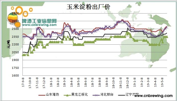 本周全国玉米总成交率为81.86%,成交率高;成交均价为1695元/吨,按照出库和贴水费共90元/吨,到港口运费160元/吨来算,则到港成本在1945元/吨左右。此前玉米拍卖均价折合成盘面价在1995元/吨左右,对玉米价格形成强支撑。原料玉米价格上涨,随之带动淀粉价格上涨,但是产品库存仍多,产品积压情况较多,且下游消费需求迟迟未见好转,因此淀粉价格上涨幅度有限。现货市场,淀粉河北报价2500-2530元/吨,平稳;山东报价2480-2550元/吨,涨20;吉林报价2350-2400元/吨,平稳。
