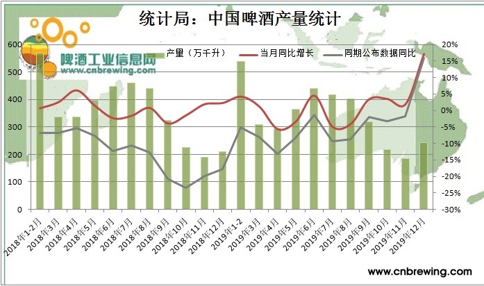 统计局:2019年1-12月中国啤酒产量同比增1.1%