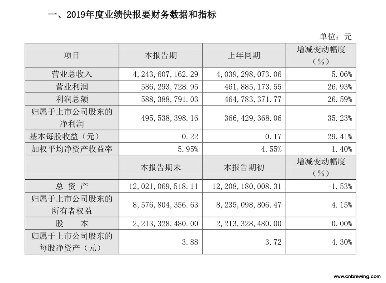 2月20日,广州珠江啤酒股份有限公司公布2019年度业绩快报,公司2019年度营业总收入42.44亿元,相比上年同期增幅5.06%。