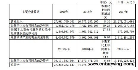 青岛啤酒(SH:600600)昨日发布的2019年财报显示,公司去年共实现啤酒销售量 805 万千升,实现营业收入人民币 279.8 亿元,同比增长5.3%;实现归属于上市公司股东的净利润人民币 18.5 亿,同比增长30.2%。
