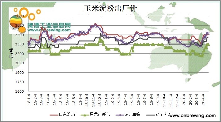 本周因原材料玉米价格走高,淀粉成本压力不断增加,大部分地区加工处于亏损状态,企业提价意愿也较为强烈,现货报价普遍提升。随着消费端恢复和天气转暖,市场需求恢复看好,但是受疫情影响有所折损,加上玉米进口、拍卖预期,会减弱玉米价格续走高的动能,上涨空间有限,后市以企稳为主。今日淀粉全国均价2512元/吨,较上周同期上涨1.4%。当前山东地区淀粉企业主流报价为2500-2530元/吨,较上周平稳;河北地区淀粉企业主流报价为2530元/吨,较上周涨30元/吨;吉林地区淀粉企业主流报价为2300元/吨,较上周平稳。黑龙江地区淀粉企业主流报价为2320-2350元/吨,较上周平稳。在淀粉价格高位盘整情况下,下游订单数量减少,淀粉加工效益并不乐观,再加上原料库存水平不高,行业开机率水平整体下滑,当前淀粉企业开工率为72%,去年同期77%。