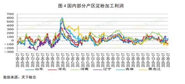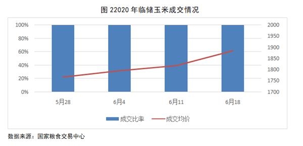 据国家粮食交易中心数据:2020年6月18日投放398万吨玉米,成交100%;剩余库存4006万吨。临储玉米四拍再次高溢价高成交,市场陷入“粮荒边缘”,渐失理性。不过如后续持续双高现象,则拍储投放或在8月下旬陷入无粮可拍的状况,此时新玉米上市尚不及。供应忧虑使得企业屯粮意愿较高,但随着临储玉米陆续出库,企业用粮不再短缺,溢价收粮意愿或将回落。