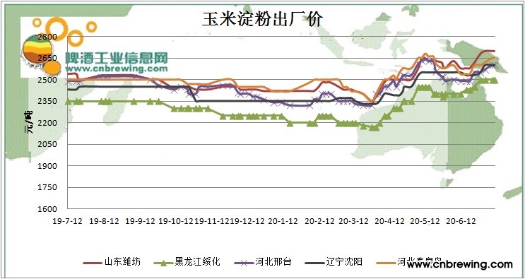 目前深加工开机率稳中趋弱,原料价格高涨,深加工企业处于持续亏损中,其中黑龙江地区亏损较大,山东、河北地区深加工也呈亏损。截止7月3日,119家深加工企业玉米收购82.6万吨,较上周增加41.1%。136家企业玉米消耗量118.8万吨,较上周增加0.8%,总体偏稳。淀粉企业开机率63.5%,同比增1.1%。82家淀粉企业淀粉库存82.4万吨,继续去库,同比低1.4%。临储玉米拍卖热情不减,依然呈现高溢价抢粮局面;前期拍卖逐渐面临出库问题。淀粉受成本走强带动,期货价突破近期高点,现货继续震荡上行。下游需求相对稳定,无爆发亮点,7-9月份是糖浆和啤酒需求的旺季,且随着中秋、国庆等假期消费的提振,需求或将增长,短期内淀粉继续跟随玉米继续上行。长期看行情易涨难跌,将维持震荡上行的趋势运行,价格或继续创下新高。内淀粉跟随玉米保持维持震荡上行趋势不变。目前山东地区玉米淀粉主流报价2680-2700元/吨左右,小涨30元/吨;河北地区淀粉企业主流报价为2600-2650元/吨,小涨30元/吨;吉林地区淀粉企业主流报价为2480-2530元/吨,平稳。黑龙江地区淀粉企业主流报价为2500元/吨,平稳。