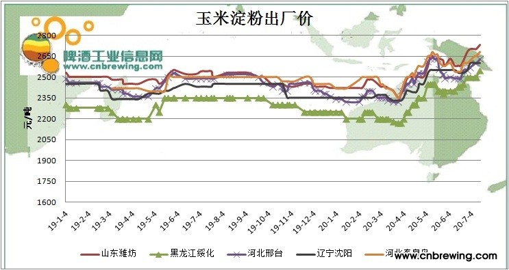 面对玉米价格的不断高涨,玉米淀粉价格跟随成本快速上涨,屡破近年来价格高位,截至7月17日玉米淀粉企业收购价月环比上涨80-140元,折算淀粉成本相当于成本增加100-190元/吨。目前华北企业玉米淀粉出厂主流价至2650-2750元/吨 ,部分企业报涨至2790元/吨; 东北地区玉米淀粉出厂主流报价2500-2600元/吨,普遍有100-150元/吨涨幅,已涨至近来看价格高位。因原料玉米价格依旧是影响玉米淀粉走势的重要因素,在玉米高位运行、行业开工率下滑的背景下,预计短期国内玉米淀粉价格仍有上涨空间,行情整体将继续维持偏强运行为主。