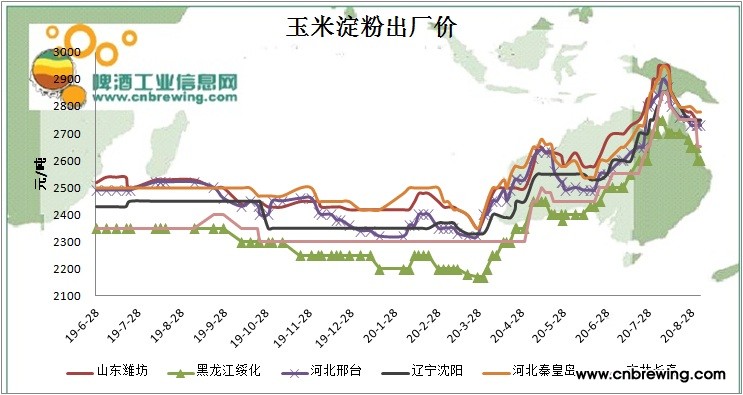 本周全国玉米淀粉均价为2720元/吨,继续小跌40元/吨左右,目前玉米市场价格震荡走弱,原料支撑趋弱,加之深加工企业产能恢复,市场供应量增加,利空淀粉价格行情,企业报价持续下调;而跌价加剧下游看空心理,市场成交并不活跃,导致淀粉市场出现恶意竞争,短期内淀粉价格弱势难改。山东地区玉米淀粉跌势已明显由急跌变为缓跌,本周成交价2730元/吨,小跌20元/吨,河北地区2730元/吨平稳,黑龙江地区2650元/吨,跌50元/吨,吉林2650元/吨,跌100元/吨 。目前市场供需格局逐渐宽松,为保证后续订单有效跟进,市场竞价氛围较重。各生产企业为吸引新签订单,实际成交仍继续下探。展望后期玉米淀粉市场,玉米依旧是淀粉价格的主要风向标。玉米市场氛围冷却,价格短期将维持缓跌态势。成本端难以提振淀粉行情,玉米淀粉市场将转由需求导向定价,在双节备货需求未有明显体现前,预计玉米淀粉价格维持稳中偏弱态势运行。