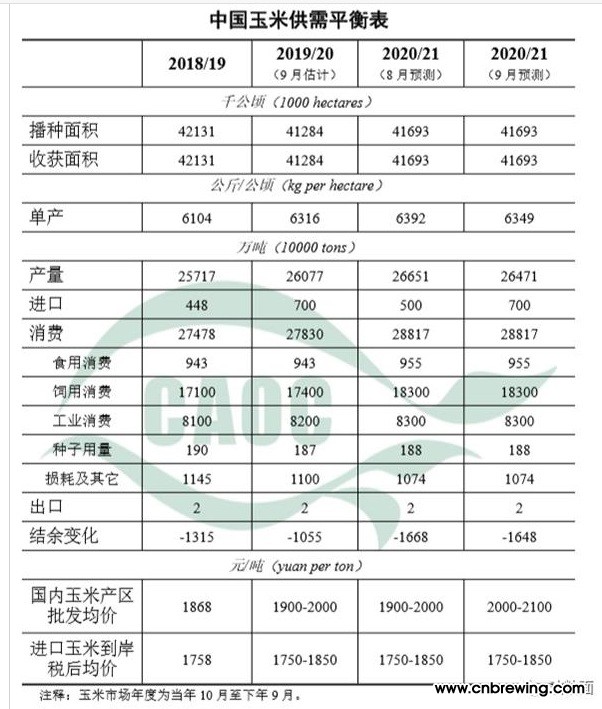 本月预测,2020/21年度,中国玉米产量2.65亿吨,比上月预测数下调180万吨,主要原因是台风造成东北部分地区玉米倒伏、单产小幅下降。但由于玉米单产已经基本形成,台风灾害影响较为有限,年度玉米产量稳中有增的趋势未变。进口量调增至700万吨,比上月预测数增加200万吨,主要原因是来自美国的进口将大幅增加。玉米消费预测维持上月不变。