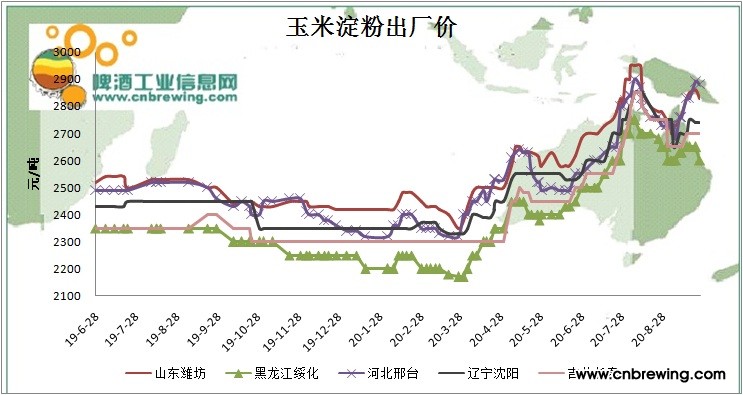 本周全国玉米淀粉均价为2800元/吨,较上周上涨20元/吨。进入9月中旬,国内玉米市场价格再度走高,原料成本再度上升,天气不断转凉,淀粉下游贸易主体补库意愿增加,成本及需求支撑下,国内淀粉价格局部走高,不过随着库存不断增加,近日华北玉米上市量明显增加,玉米价格呈跌势,淀粉价格维持弱势运行。价格方面:山东地区玉米淀粉现货价2820-2860元/吨,河北地区2840-2880元/吨,较周初下跌30元/吨;黑龙江地区2600元/吨,吉林2650-2700元/吨,价格稳定。展望后期玉米淀粉市场,玉米依旧是淀粉价格的主要风向标。玉米淀粉市场由成本和需求导向定价,在双节备货需求未有明显体现前,预计玉米淀粉价格维持大体平稳,区间窄幅震荡。