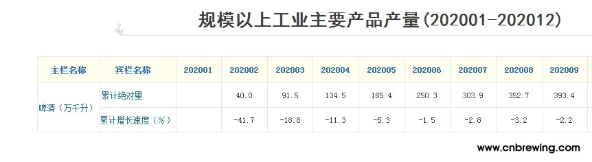 2020年9月,山东省规模以上啤酒企业产量40.7万千升,上月为48.8万千升,同比增长7.1%。2020年1-9月,累计产量393.4万千升,同比减少2.2%。