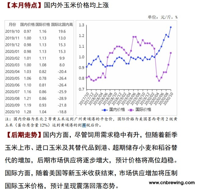 10 月份,美国农业部(USDA)供需预测报告主动调减美国玉米产量和全球玉米库存水平,同时拉尼娜气候影响南美玉米播种进度,中国对美玉米采购需求增加,这些因素刺激期货市场做多情绪,推动国际价格继续大幅上涨。10 月份,美国墨西哥湾 2 级黄玉米平均离岸价每吨 221 美元,环比涨 18.2%,同比涨 27.0%;芝加哥期货交易所(CBOT)玉米主力合约(2020 年 12 月)收盘月均价每吨 157 美元,环比涨 9.0%,同比涨 2.6%。