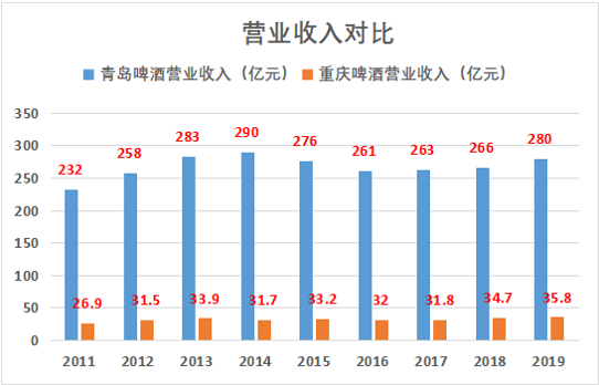 两者营业收入近9年增幅都较为有限,青岛啤酒几乎是重庆啤酒的7-8倍。