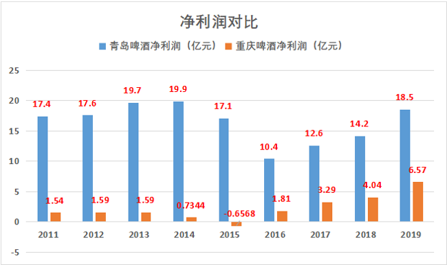 青岛啤酒的净利润表现为2011-2015年较为稳定,2016极具下降到低点,2017-2019又稳定上升的态势,重庆啤酒也呈现类似特征,但是不同的是重庆啤酒近4年的净利润增长速度远超青岛啤酒,虽然青岛啤酒的营业收入将近达到重庆啤酒的8倍,但是净利润只有重庆啤酒的3倍。