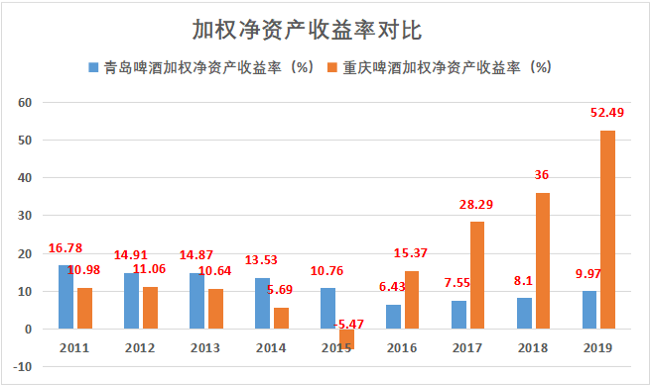 2011-2015年青岛啤酒的加权净资产收益率都高于重庆啤酒,但是2016年以后形势陡然反转,重庆啤酒的加权净资产收益率高速增长,而青岛啤酒止步不前,显然重庆啤酒带给投资者的未来增长空间更大。市场也因此给予了重庆啤酒更高的估值,近四年重庆啤酒涨幅达10倍,青岛啤酒的涨幅只有4倍。
