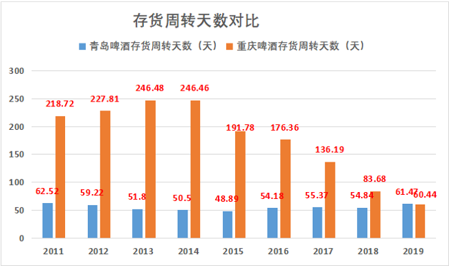存货周转天数反映了一个公司的营业管理能力,同类比较,周转天数越低反应公司管理水平越高,存货成本越低,那么产品竞争力相应就越强。通过比较发现青岛啤酒存货周转天数数十年几乎就在一个水平上,徘徊在60天左右,而重庆啤酒存货周转天数从2015年开始快速下降,营运能力得到快速提升,至2019年存货周转天数已经低于青岛啤酒,实现了反超,重庆啤酒给了投资者更大的想象空间。