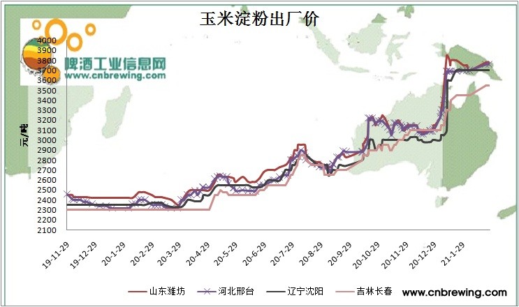 本周国内玉米淀粉均价3630元/吨,较节前上涨30元/吨。春节后随着国内玉米淀粉上下游市场陆续复工,市场喜迎价格抬头,目前华北地区主要企业报价在3700-3800元/吨,价格较节前累计上涨30-80元/吨不等。玉米淀粉价格上涨的主要推动因素依然是原料玉米。玉米价格从2020年开始一路飙升,2021年开局更是继续大幅度上扬至3000元/吨左右。春节刚过,深加工企业就表现出较强的收购意愿,连续提价补充原料库存,主流收购价格较前期上涨20-100元/吨不等。由于贸易环节及深加工企业提价收粮意向强烈,推动玉米价格继续上涨,对于玉米淀粉行情形成明显利好提振。经历节后价格连续小幅上调后,市场人士对于玉米淀粉行情再度攀高存有争议,暂转入平稳观望阶段,中下游市场高价购买力不足及玉米市场上量增加均对生产企业挺价心态形成一定打压。短期内玉米淀粉现货市场或高位僵持运行,供应预收合同为主。随着主要企业开工恢复正常,市场供应量增加,需求支撑力度不延续,部分地区库存及销售压力增加,降价促销意向或有增强,成交商谈趋于灵活,短期内高位震荡为主,价格调整空间相对有限。山东地区玉米淀粉报价区间3780元/吨同,涨80元/吨,河北地区玉米淀粉价格在3760元/吨,涨60元/吨,黑龙江和吉林3550元/吨,涨50-100元/吨。