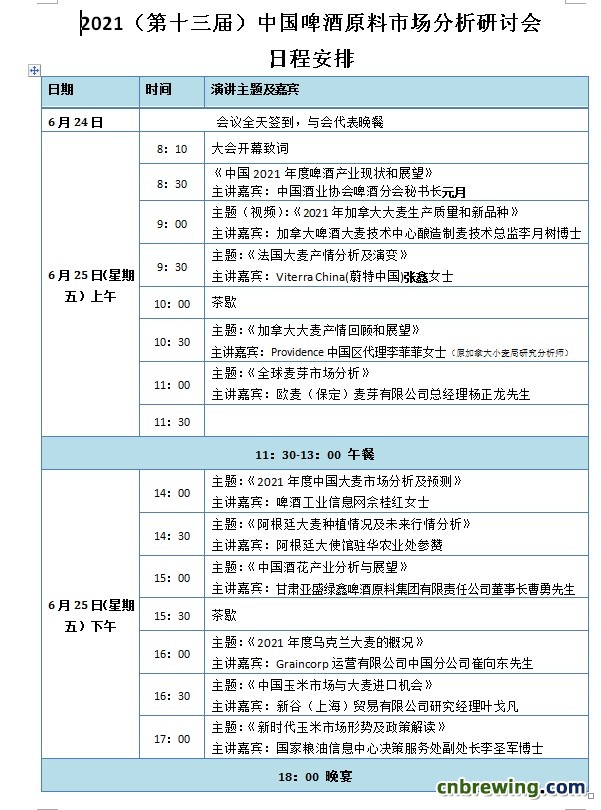 2021年第十三届中国啤酒原料分析研讨会将于6月24-25日在青岛召开,今年幸邀请到阿根廷农业参赞,中国酒业协会啤酒分会秘书长元月,Viterra China(蔚特中国)张鑫、Providence中国区代理李菲菲、欧麦(保定)麦芽有限公司总经理杨正龙、Graincorp运营有限公司中国分公司崔向东、国家粮油信息中心决策服务处副处长李圣军位、甘肃亚盛绿鑫啤酒原料集团有限责任公司董事长曹勇和新谷(上海)贸易有限公司研究经理叶戈凡等10位嘉宾莅临参加研讨会。目前会议已经进入倒计,会场已经爆满,欲报名从速,报名热线:13047688963(微信同号)。