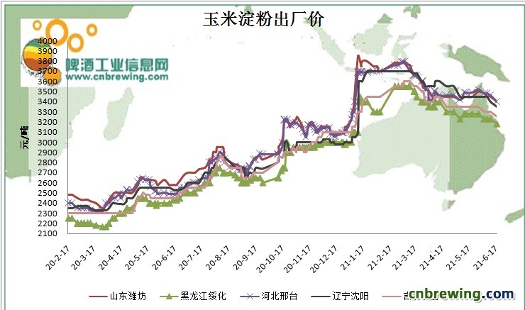 本周国内玉米淀粉均价3400元/吨,较上周稳中有跌,主要因为玉米市场价格偏弱。淀粉受开机下降,需求有好转预期,但是库存依旧高拉拖累整体行情。目前淀粉仍走玉米原料成本定价的逻辑,走势将取决于玉米现货价格,在玉米价格回调压力情况下,淀粉本身库存累积回调压力也较大。本周玉米淀粉价格依旧小跌,山东地区主流报价参价3400元/吨,吉林地区3250元/吨,黑龙江3180元/吨,玉米市场继续偏弱,实际签单价格可议。