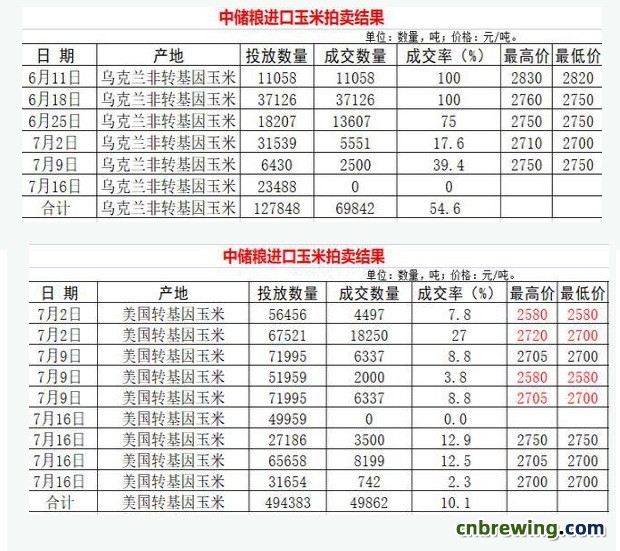 6月11日、6月18日、6月25日、7月2日、7月9日、7月16日中储粮分别投放11058吨、37126吨、18207吨、155516吨、130384吨、197945吨进口乌克兰非转基因玉米和美国转基因玉米,分别成交11058吨、37126吨、13607吨、28298吨、10837吨、12441吨,成交率分别为100%、100%、75%、18.2%、8.3%、6.3%。