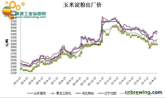 本周国内玉米淀粉均价3240元/吨,部分地区涨跌互显,整体呈上行趋势。8月以来国内玉米淀粉现货市场上涨势头强劲,各企业报价纷纷追涨。库存压力下降,原材料价格上涨、部分企业检修造成供应紧张等因素成为市场讨论的主要利好支撑。但从目前市场情况来看,运力紧张运费上涨的局面维持多久、下游对于高价货源的接受程度以及不断抬高的价格能否被真正坐实,仍需时间来检验。经过半月时间玉米淀粉价格连续推升至高位运行,面对疫情防控开工负荷不稳定、物流运费及产品成本增加,终端市场承压较重,对于高价抵触情绪渐增。同时新玉米上市期逐步临近,下游把控风险心理增强,市场整体采购情绪谨慎,由此玉米淀粉价格继续上行的时间及空间或相对有限。目前山东地区主流报价3300-3350元/吨,整体平稳,局部有跌50元/吨;吉林地区3050元/吨,升50元/吨,河北地区主流报价3350-3390元/吨,平稳。糖浆方面,山东地区2950-3100元/吨,平稳。