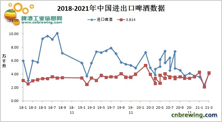 2021年8月,中国出口啤酒3.311万千升,同比下降5.9%;1-8月累计出口啤酒28.602万千升,同比增长15.5%