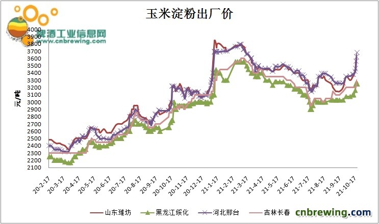 本周山东、河北淀粉价格大幅上涨,较上周大涨200元/吨,截止10月21日玉米淀粉均价3480元/吨,周比上涨196元/吨,涨幅高达6%。虽然玉米价格震荡偏弱格局,但是淀粉供需偏紧影响价格低位反弹,开启上涨模式。供需方面,受限电限产影响,玉米淀粉产量下降明显,周度开工率持续50%左右。玉米淀粉去库存进度良好,山东、吉林、辽宁等地库存水平已经低于往年同期水平,企业销售压力明显减轻。成本端,国内煤价大幅上涨,生产成本升高,理论上加工成本调整为550/600元/吨,上涨150-200元/吨。成本走高,再加上市场供需紧张,企业提价意愿明显。冬季到来,随着北方供暖的展开,煤炭的需求仍有上升空间,预期淀粉开工率受到打压。短期内来看供应紧张情况继续,预计价格维持偏强运行。价格方面,截止10月22日,山东玉米淀粉报价3600-3650元/吨,主流成交价3550-3600元/吨左右,周比上涨250元/吨左右;河北玉米淀粉报价3600-3680元/吨,主流成交价3600元/吨左右。东北玉米淀粉出厂价3200-3300元/吨。另外山东糖浆主流均价3150-3250元/吨左右,周涨200元/吨。