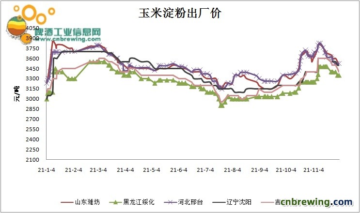 本周玉米淀粉均价3500,较上周下跌50元/吨,目前淀粉行业开工率明显上升,产量陡增,供应明显改善。供应端:一是限电限产影响减弱; 二是生产利润可观。高利润驱使下企业开工积极性较高。需求端:一是高价下游采购积极性不高,前期订单基本未执行完毕,原料下跌预期下采购策略偏谨慎。二是,双十一备货期已过,下游造纸及食品需求明显下降。供应量持续增加但需求未有明显放量,导致库存开始累积。淀粉价格承压高位回落。预期本月产量将继续增加,价格仍有下调空间。本周山东淀粉主流成交3480元/吨左右,较上月高点落300元/吨; 吉林成交价3300元/吨左右,较上月高点跌300元/吨左右。另外山东麦芽糖浆报价3250-3350元/吨,成交3250元/吨左右。