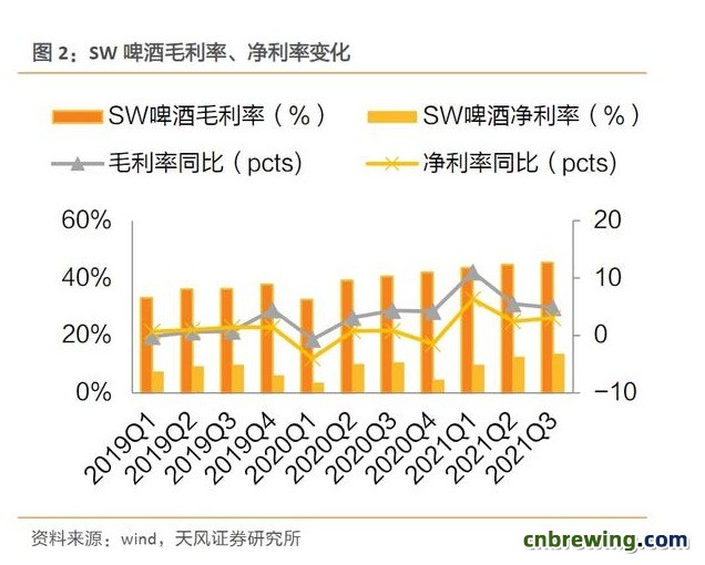 截至今年10月,大麦较2020年年初上涨20.82%,截至11月,玻璃/瓦楞纸/铝合金相比2020年年初分别上涨12.52%、35.79%以及41.50%。由于原材料在啤酒成本中占比高,上游涨价使得啤酒企业毛利率承压较大。