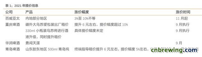 成本端承压下,各啤酒公司从第三季度起陆续发布公告宣布涨价,提价的依据分别根据公司战略目标、优势市场区域、成本结构制定而体现出差异,但提价幅度基本在10%左右。