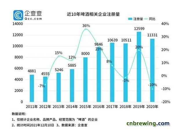 2011-2019年我国啤酒相关企业年注册量逐年攀升,2015年注册量达8000家,同比增长36%,达到近年来增速峰值。2019年注册量达1.26万家,为历年来最高,同比增长20%。2020年注册量略有下降,共新增注册量1.13万家,同比下降10%。