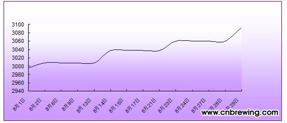 本月(8月1日—8月31日)全国玉米淀粉价格震荡走高,长春地区月初2950元/吨,月末3070元/吨,上涨120元/吨;沈阳地区月初月末2900元/吨,月末3000元/吨,上涨100元/吨。石家庄地区月初3050元/吨,月末3100元/吨,上涨50元左右/吨。
